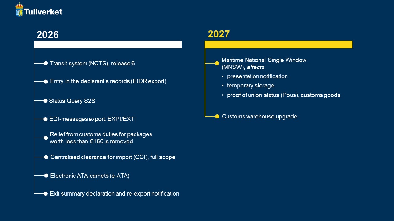 Centralised customs clearance will be implemented in two parts. The first part covered standard customs declarations and was introduced in Sweden in 2025. The second part covers simplified and supplementary declarations as well as entry in the declarant's records and will be introduced in Sweden on 1 September 2026.