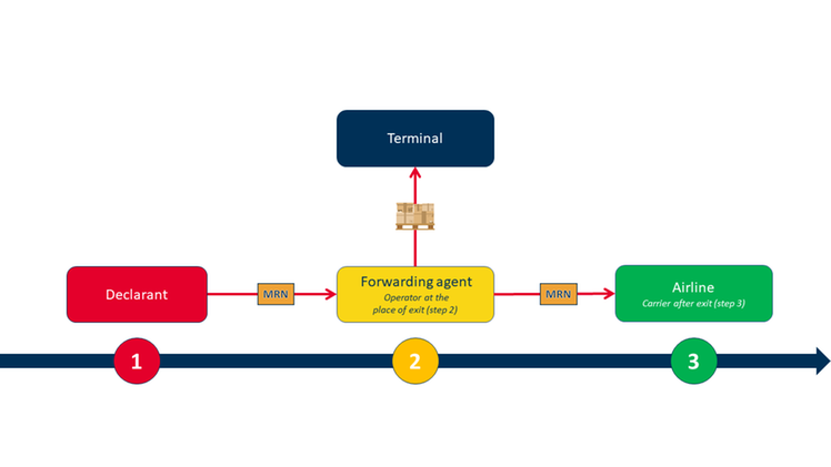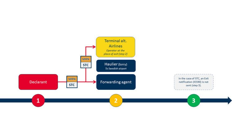 - The forwarding agent sends the MRN number of the export customs declaration and information that STC is to be used to one or more operators at the place of exit, in this case the terminal that holds a decision on an approved place of exit at the airport where the goods are taken over within the framework of the through freight operation, or alternatively to the airline.