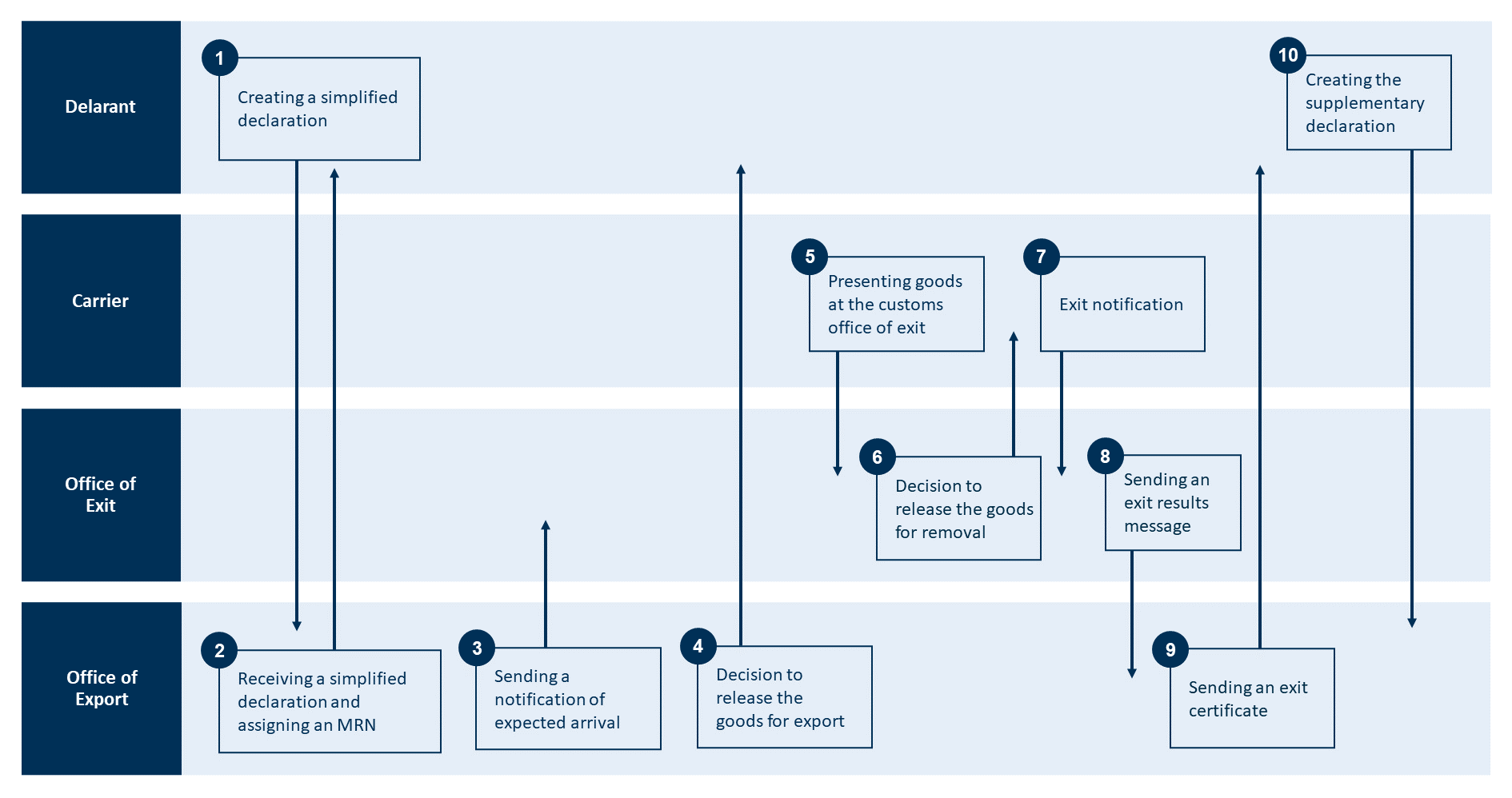 The image below describes how to submit a simplified export declaration. The information is exchanged in separate messages. Under the image, you can read descriptions of what happens in each step.