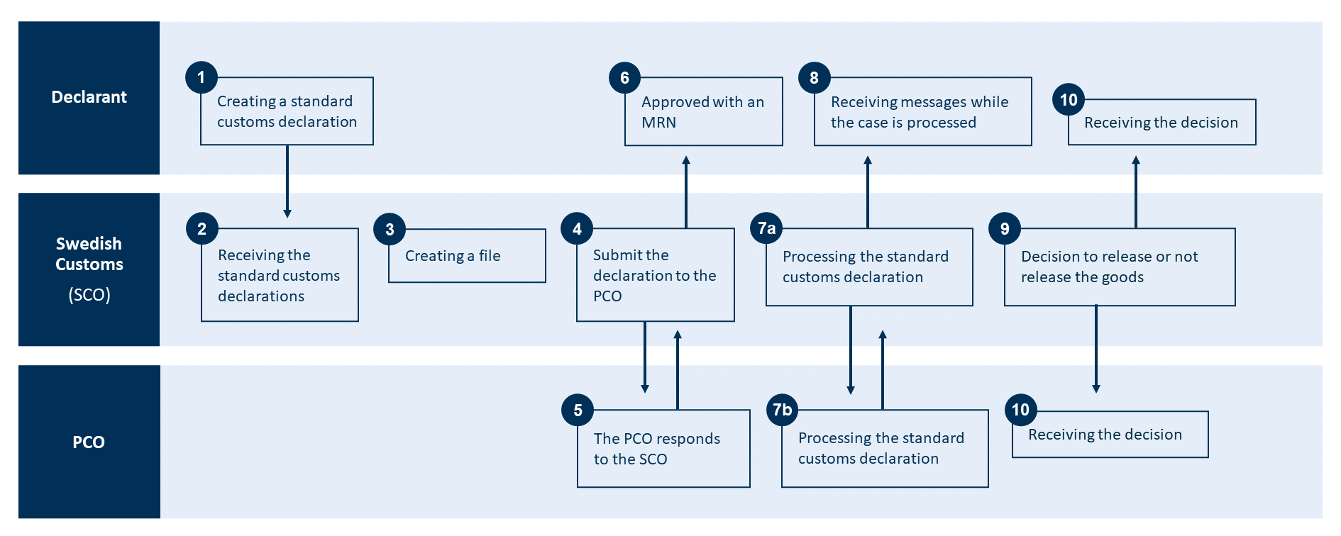 The picture below shows how it works when you use centralised clearance and submit a standard customs declaration to Swedish Customs. Under the image, you can read descriptions of what happens in each step.