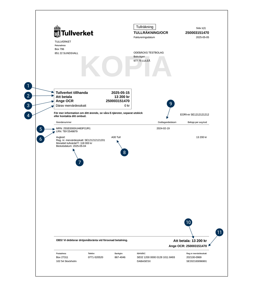 If you are a Swedish company, please pay your customs invoice to Swedish Customs’ Bankgiro number 867-4046. The OCR is the same as your customs invoice number.