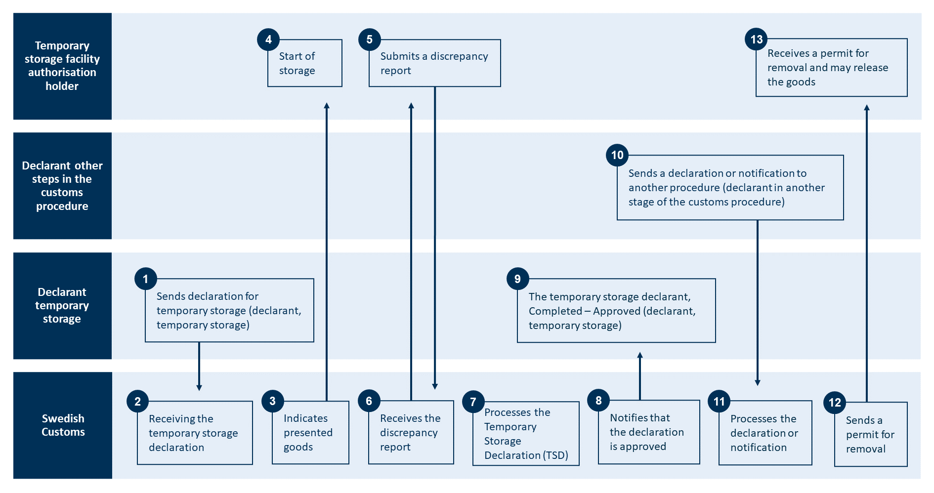 The image below illustrates the steps of the procedure for holders of a temporary storage authorisation. Under the image, you can read descriptions of what happens in each step.