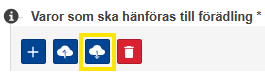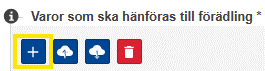Välj Lägg till (tryck på "+"-tecknet) om du har ett mindre antal varor. Om du har många varor kan du välja Exportera (tredje ikonen) och Importera (andra ikonen) för att ladda upp uppgifterna i en Excel-mall (se beskrivning längre ned).