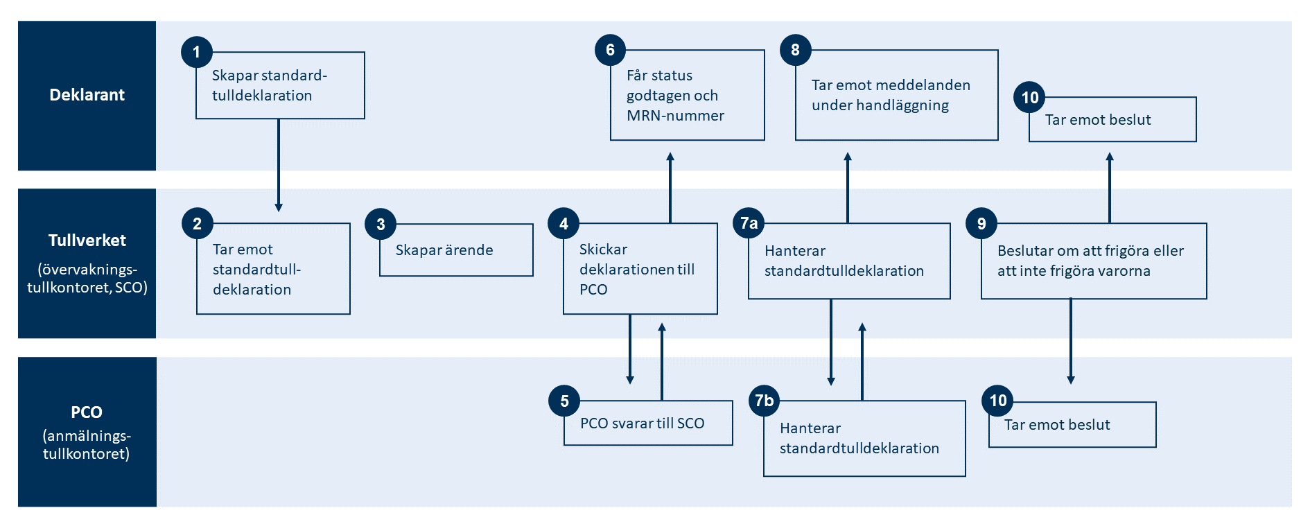 Här kan du läsa om hur det går till när du använder dig av centraliserad klarering och lämnar en standardtulldeklaration till Tullverket.