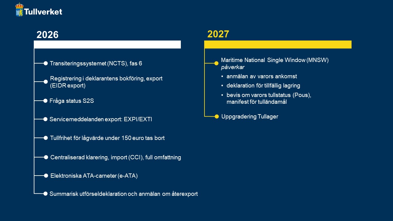 Omställning pågår till en helt digitaliserad tullhantering. Stora delar av import- och exportsystemen är på plats, men utvecklingsarbetet fortsätter. Läs mer om vad som är på gång under de närmsta åren.