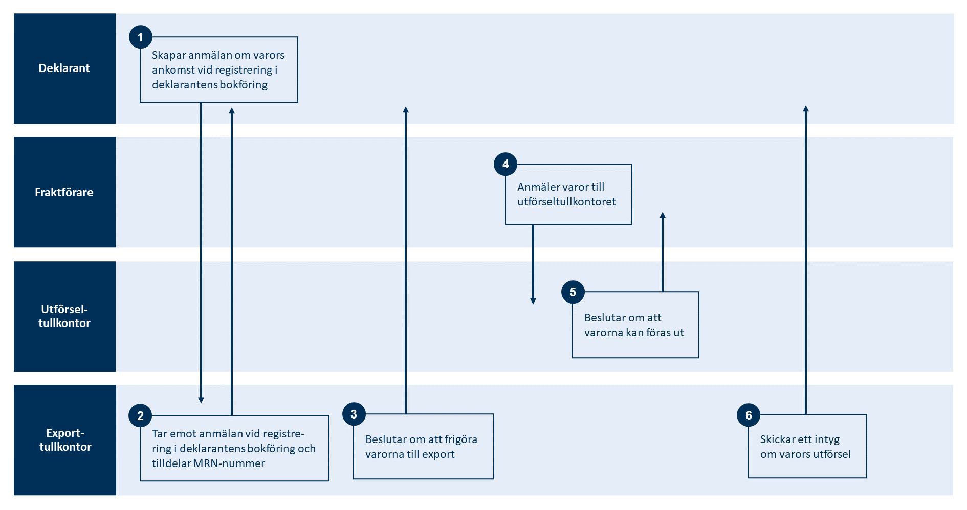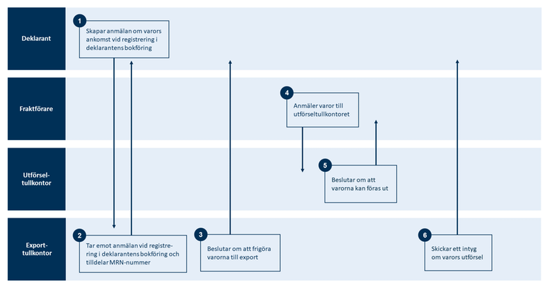 Bilden nedan visar hur processen ser ut när du lämnar en anmälan av varors ankomst efter registrering i deklarantens bokföring vid export. Informationsutbytet sker i separata meddelanden. Under bilden kan du läsa beskrivningar av vad som sker i varje steg.