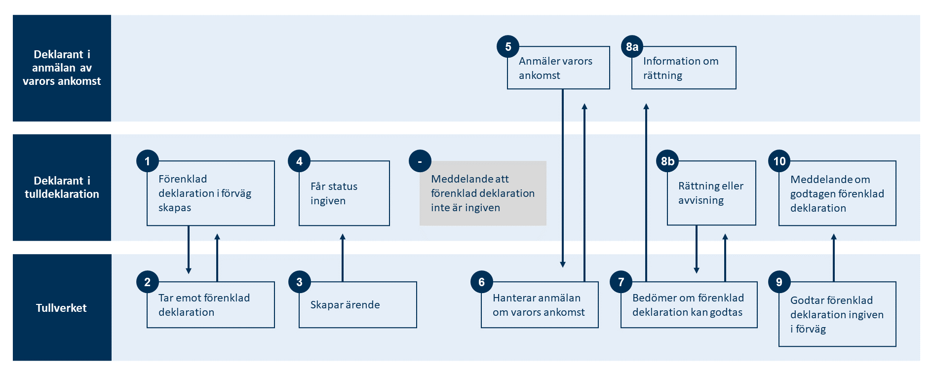 Bilden nedan visar hur det går till när du lämnar en förenklad deklaration i förväg. Under bilden kan du läsa beskrivningar av roller och av vad som sker i varje steg.
