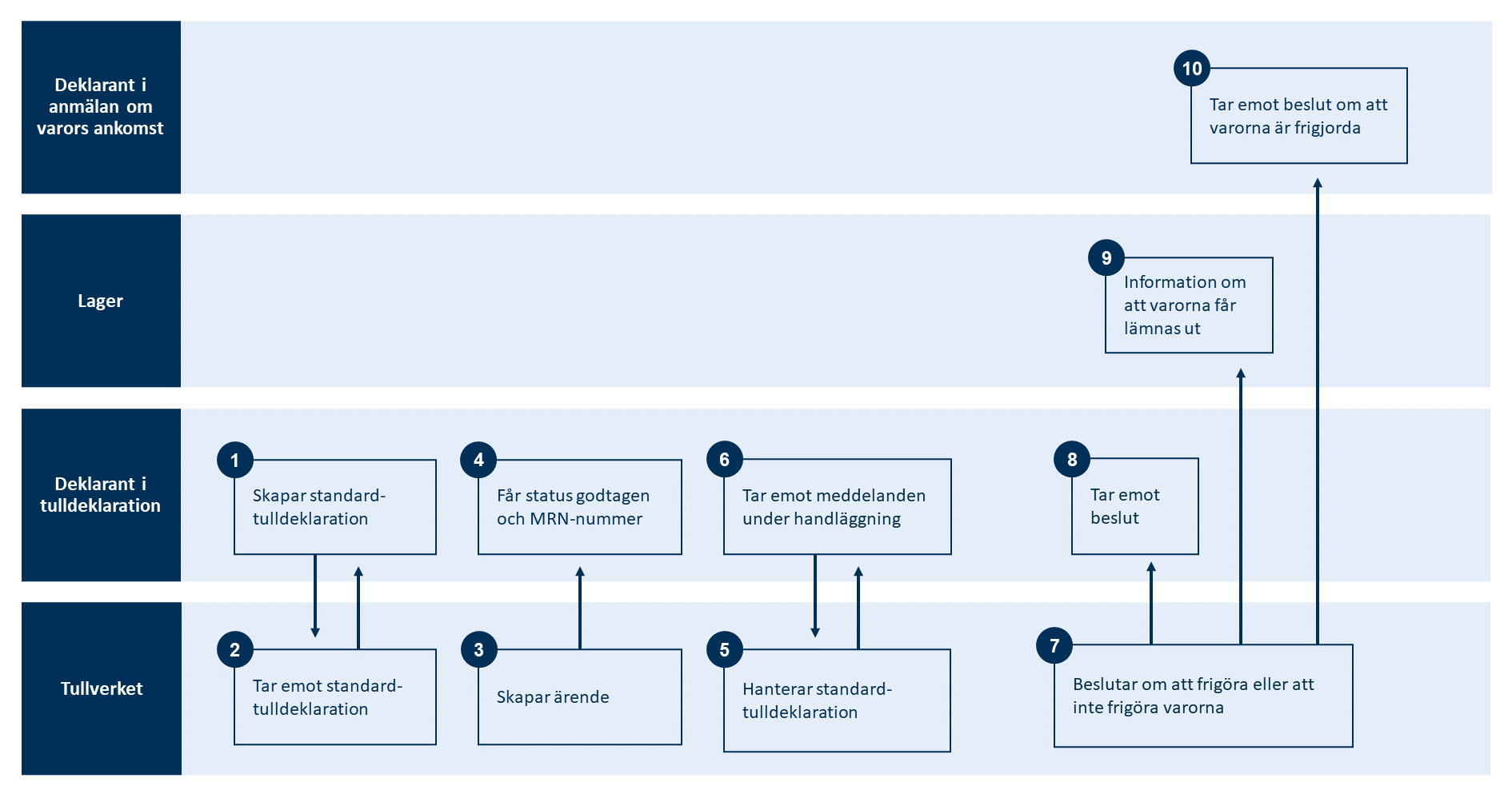 Bilden nedan visar hur det går till när du lämnar en standardtulldeklaration. Under bilden kan du läsa beskrivningar av vad som sker i varje steg.