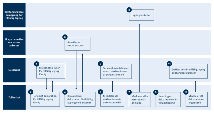 Bilden nedan visar de olika processtegen när en deklaration för tillfällig lagring för flygförsändelser lämnas i förväg. Under bilden kan du läsa beskrivningar av vad som sker i varje steg.