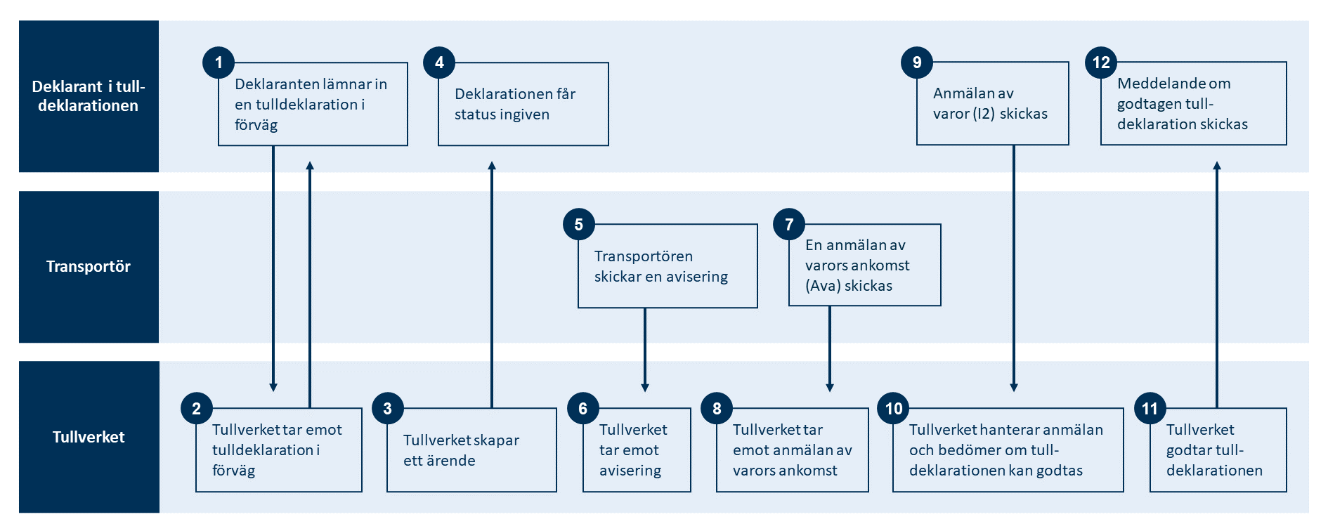 - Om uppgifterna är rätt skickas ett meddelande om att deklarationen är mottagen tillbaks till deklaranten i tulldeklarationen.