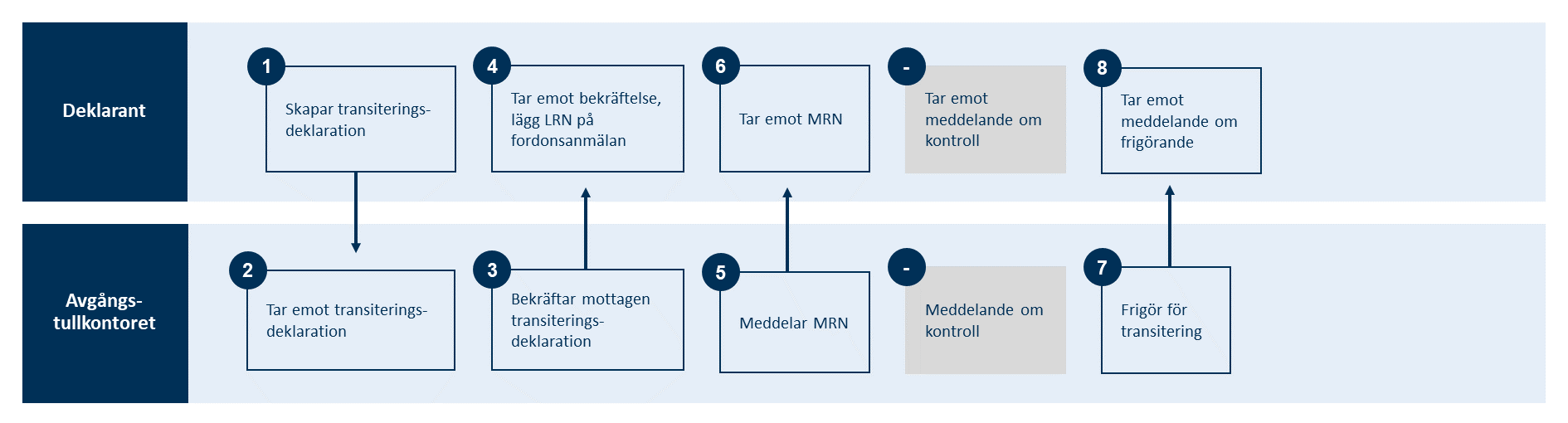 Bilden nedan visar hur det går till när du lämnar en transiteringsdeklaration enligt normalförfarandet. Under bilden kan du läsa beskrivningar av vad som sker i varje steg.